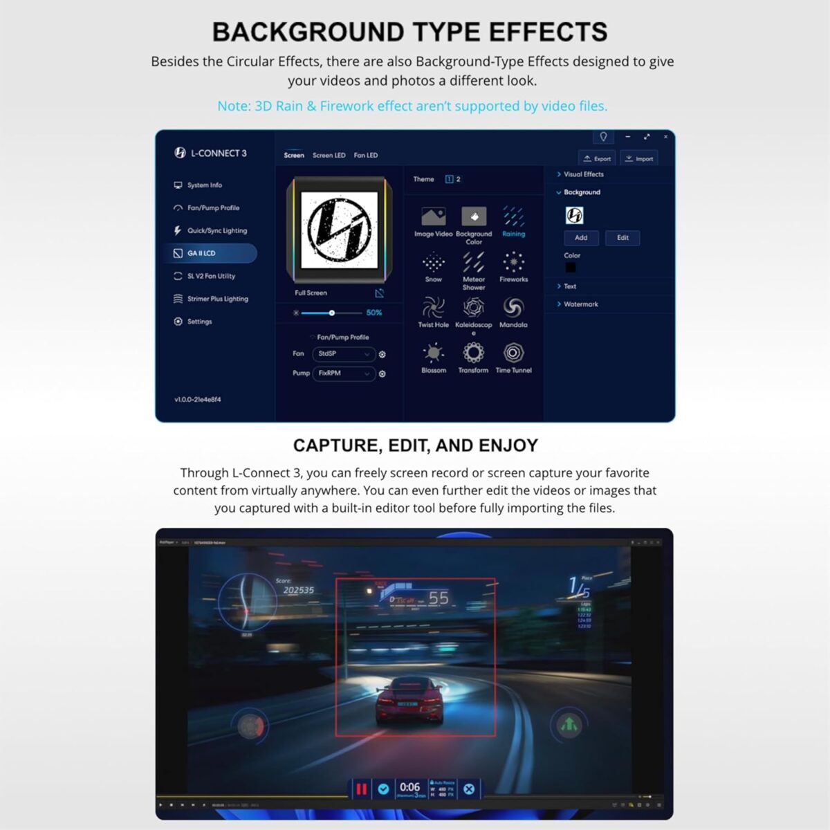 Ο έλεγχος της Galahad II LCD AIO είναι απλός χάρη στο L-Connect 3. Με αυτή τη φιλική προς το χρήστη εφαρμογή, μπορείτε να ελέγχετε τις ταχύτητες της αντλίας και του ανεμιστήρα, επιτρέποντάς σας να δημιουργήσετε τις ιδανικές συνθήκες για την ψύξη της CPU σας. Επιπλέον, μπορείτε να διαχειριστείτε την αισθητική της Galahad II LCD AIO. Αυτό περιλαμβάνει τη ρύθμιση της οθόνης LCD με εικόνες, βίντεο και εφέ, καθώς και τον έλεγχο του φωτισμού RGB στην αντλία και τους ανεμιστήρες ARGB. Επιπλέον, μπορείτε επίσης να συγχρονίσετε οποιαδήποτε άλλα προϊόντα RGB της Lian Li μαζί με τη Galahad II για να δημιουργήσετε ένα ενιαίο θέμα στον υπολογιστή παιχνιδιών σας.