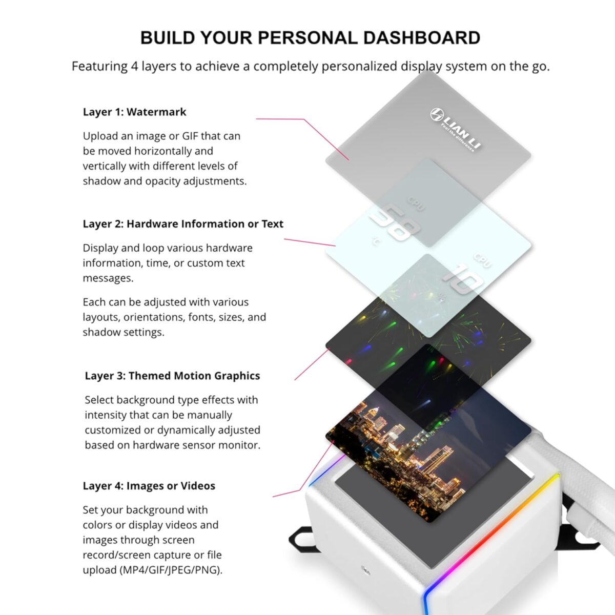 Το Lian Li Galahad II LCD AIO είναι το πρώτο Cooler της Lian Li που διαθέτει οθόνη IPS 2,88″. Αυτή η οθόνη 480 x 480 μπορεί να χρησιμοποιηθεί για μια μεγάλη ποικιλία εργασιών. Αυτό περιλαμβάνει την εμφάνιση σημαντικών πληροφοριών συστήματος, όπως θερμοκρασίες CPU ή FPS στο παιχνίδι. Παράλληλα, μπορείτε να αξιοποιήσετε την οθόνη για την ενίσχυση της αισθητικής του υπολογιστή παιχνιδιών σας. Για την απόλυτη εξατομικευμένη πινελιά, αυτή η οθόνη υποστηρίζει αρχεία JPEG, PNG, GIF ή ακόμη και MP4, επιτρέποντάς σας να εμφανίζετε προσαρμοσμένο περιεχόμενο, όπως ένα στιγμιότυπο του αγαπημένου σας παιχνιδιού.