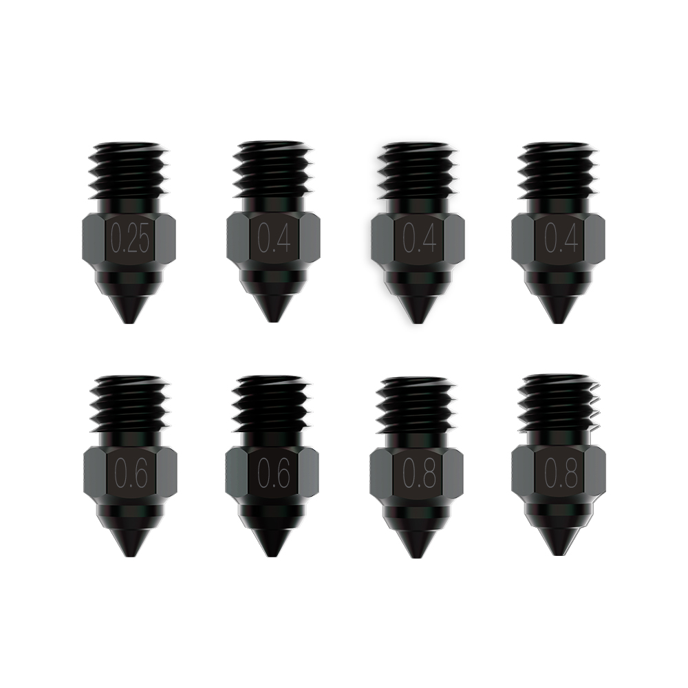 Το σετ περιλαμβάνει 8 ακροφύσια διαφορετικών μεγεθών, προσφέροντας την ευελιξία επιλογής μεταξύ μέγιστης λεπτομέρειας (0.25mm) και ταχύτατης παραγωγής (0.6mm).