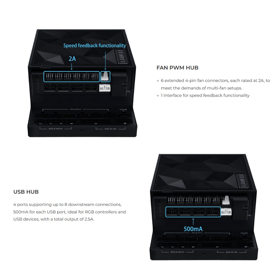 6 εκτεταμένες υποδοχές ανεμιστήρων 4 ακίδων, κάθε μία με ονομαστική ισχύ 2Α, για να ανταποκρίνονται στις απαιτήσεις των ρυθμίσεων πολλαπλών ανεμιστήρων.